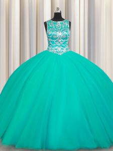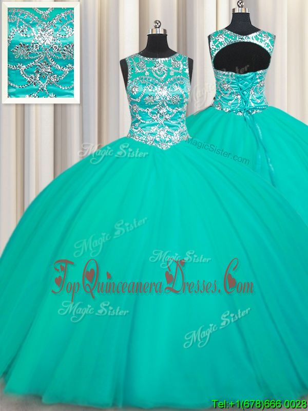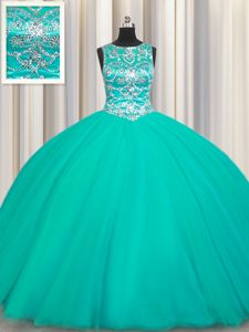 Superior Scoop Sleeveless Tulle Floor Length Lace Up Ball Gown Prom Dress in Turquoise for with Appliques