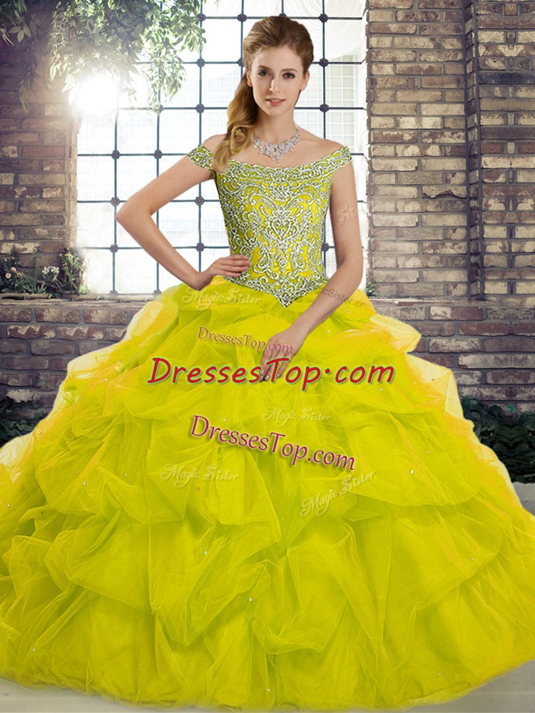 Superior Tulle Sleeveless 15th Birthday Dress Brush Train and Beading and Pick Ups