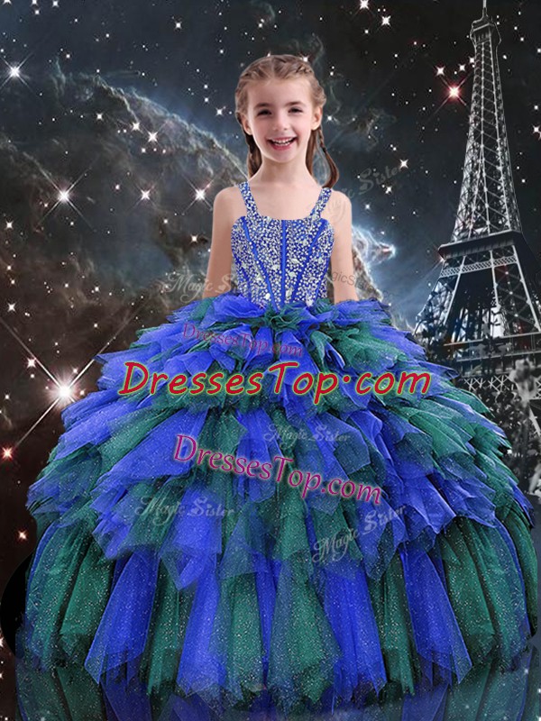 Sweet Ball Gowns Pageant Dress for Womens Blue Straps Tulle Sleeveless Floor Length Lace Up