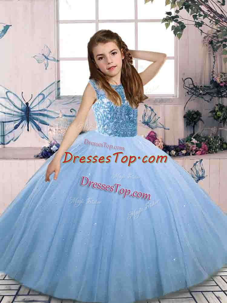 Sweet Blue Lace Up Scoop Beading Little Girl Pageant Gowns Tulle Sleeveless
