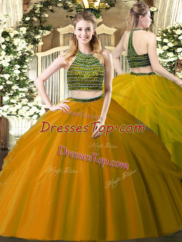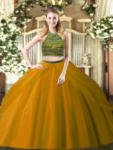Sweet Brown Vestidos de Quinceanera Military Ball and Sweet 16 and Quinceanera with Beading Halter Top Sleeveless Zipper