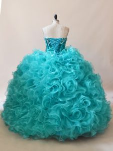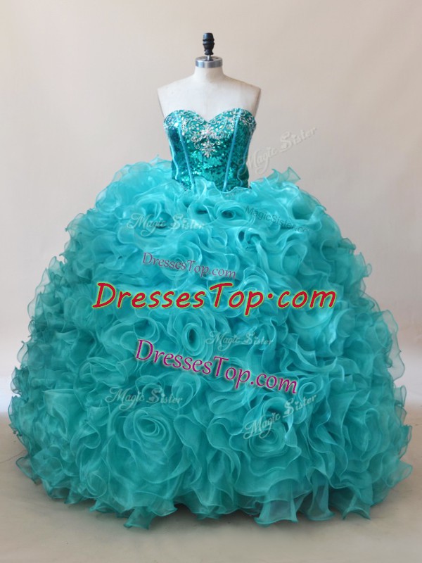 Sweet Fabric With Rolling Flowers Sleeveless Floor Length Quince Ball Gowns and Ruffles and Sequins