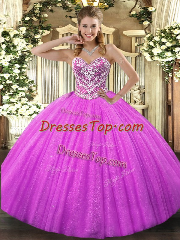 Sweet Fuchsia Ball Gowns Tulle Sweetheart Sleeveless Beading Floor Length Lace Up Sweet 16 Dresses