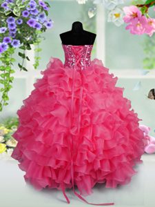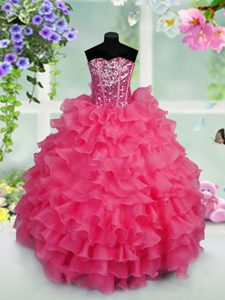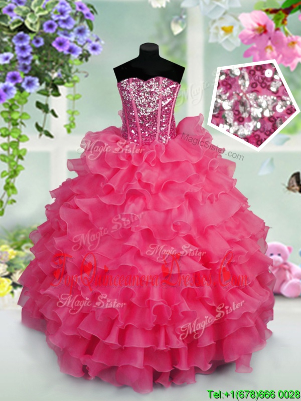 Sweet Hot Pink Ball Gowns Ruffled Layers and Sequins Pageant Dress Lace Up Organza Sleeveless Floor Length