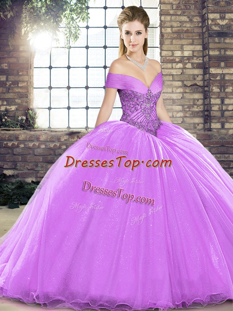 Sweet Lavender Lace Up Off The Shoulder Beading Sweet 16 Dress Organza Sleeveless Brush Train