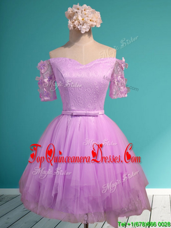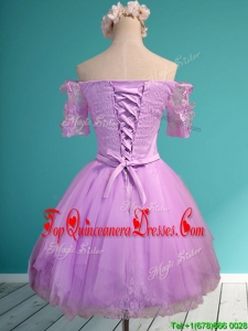 Sweet Lilac Off the Shoulder Short Sleeves Quinceanera Dama Dress with Appliques and Belt