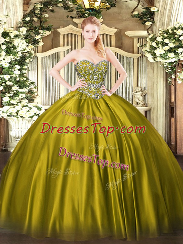 Sweet Olive Green Ball Gowns Satin Sweetheart Sleeveless Beading Floor Length Lace Up Quinceanera Gowns