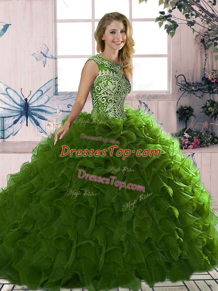 Sweet Olive Green Scoop Neckline Beading and Ruffles Sweet 16 Dress Sleeveless Lace Up