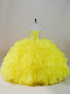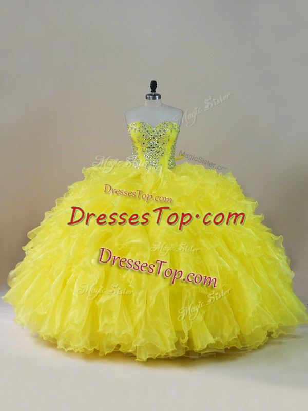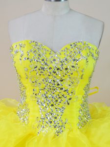 Sweet Sleeveless Floor Length Beading and Ruffles Lace Up Quince Ball Gowns with Yellow