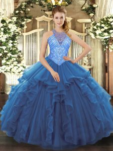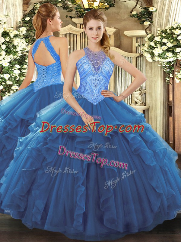 Sweet Sleeveless Organza Floor Length Lace Up Ball Gown Prom Dress in Blue with Beading and Ruffles