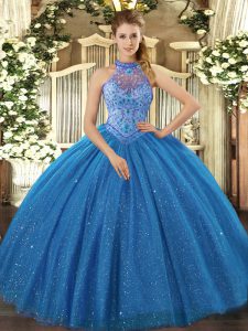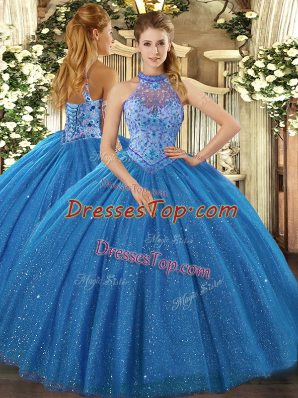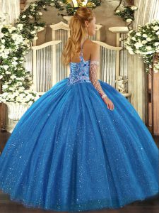 Sweet Sleeveless Tulle Floor Length Lace Up 15th Birthday Dress in Blue with Beading and Embroidery