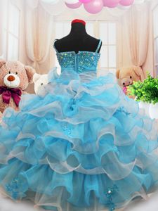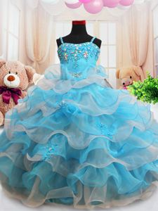 Sweet Straps Straps Floor Length Baby Blue Pageant Dresses Organza Sleeveless Beading and Appliques and Ruffled Layers