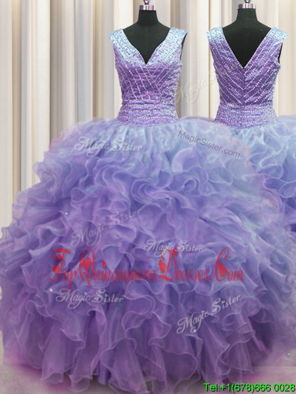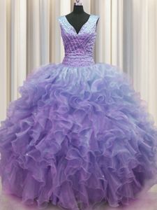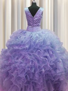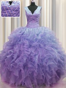 Sweet V Neck Zipper Up Lavender Sleeveless Ruffles Floor Length Vestidos de Quinceanera