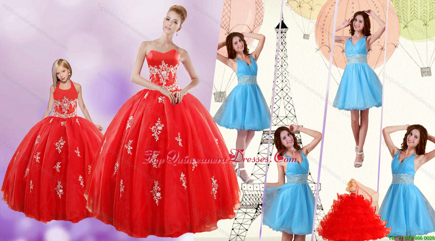 Sweetheart Ball Gown Red Quinceanera Gown and V Neck Beading Short Prom Dresses and Red Halter Top Little Girl Dress