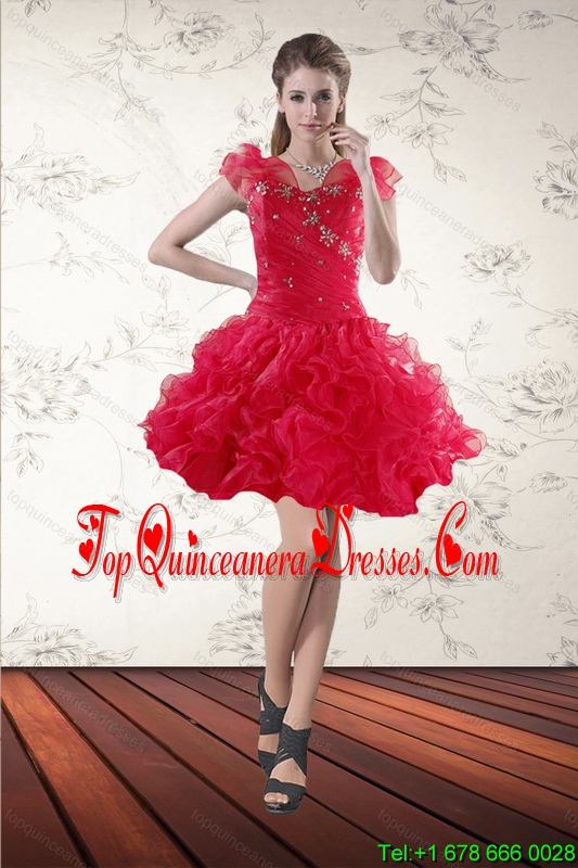 Sweetheart Red 2015 Quinceanera Dama Dresses with Ruffled Layers and Beading