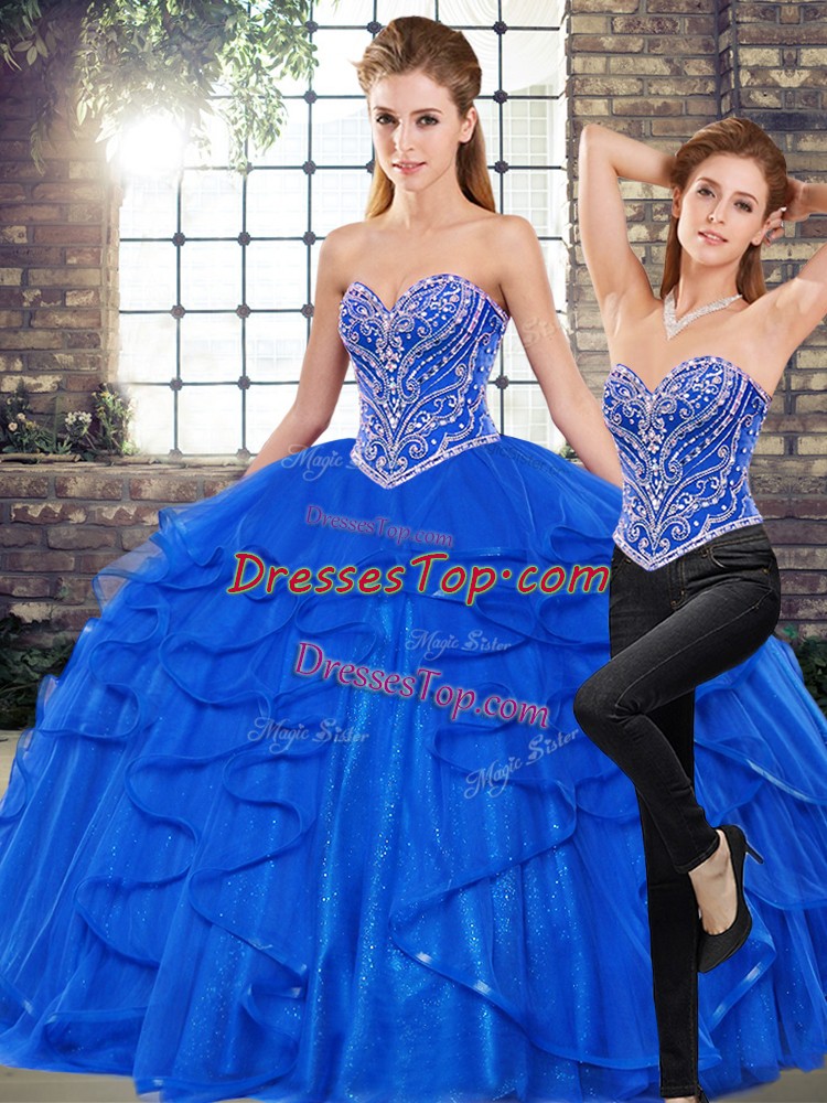 Sweetheart Sleeveless 15th Birthday Dress Floor Length Beading and Ruffles Royal Blue Tulle