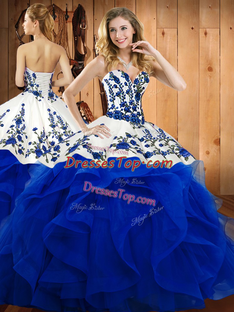Sweetheart Sleeveless 15th Birthday Dress Floor Length Embroidery and Ruffles Blue Satin and Organza