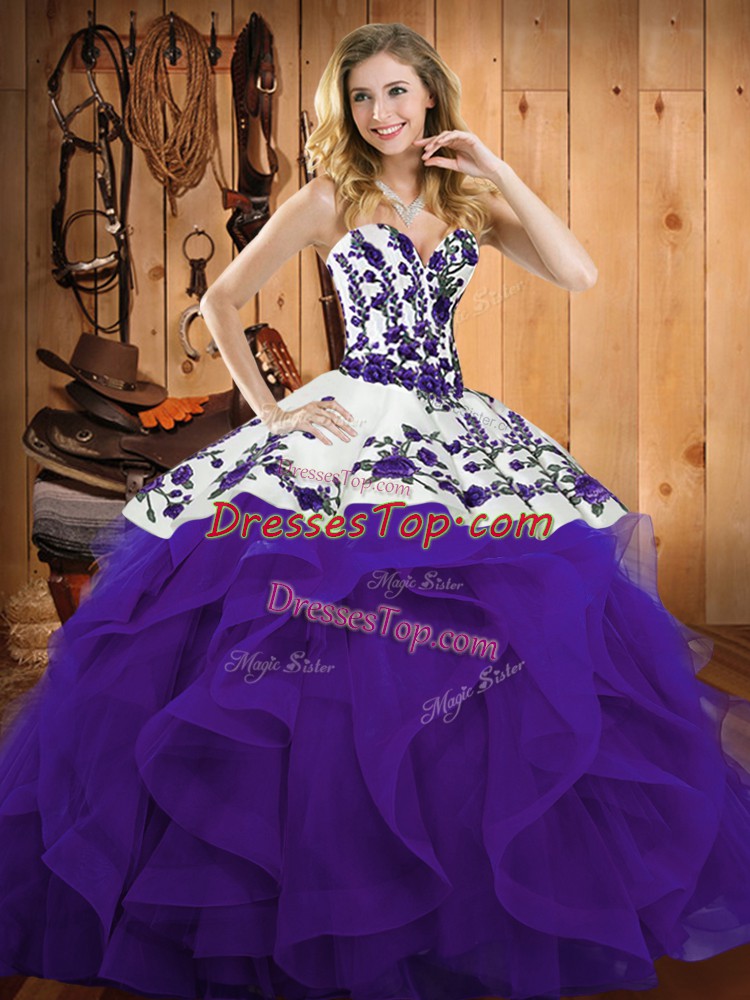 Sweetheart Sleeveless 15th Birthday Dress Floor Length Embroidery and Ruffles Purple Satin and Organza