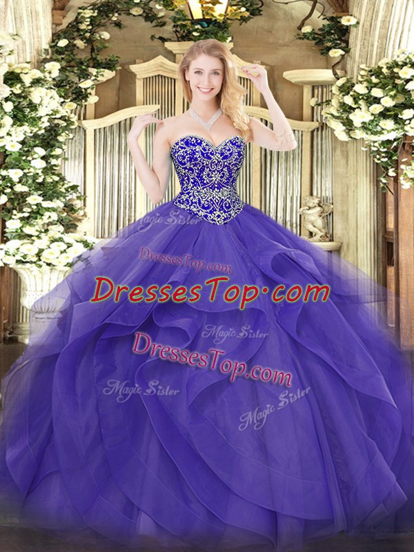 Sweetheart Sleeveless Ball Gown Prom Dress Floor Length Beading and Ruffles Purple Tulle