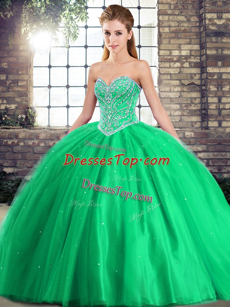 Sweetheart Sleeveless Brush Train Lace Up Ball Gown Prom Dress Green Tulle