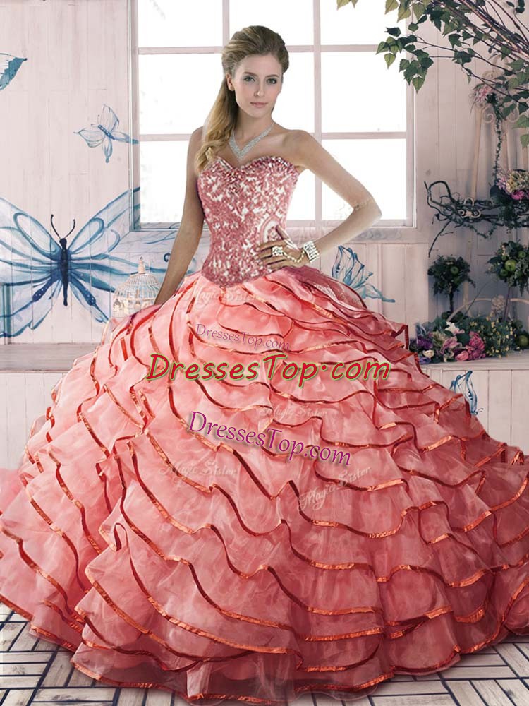 Sweetheart Sleeveless Brush Train Lace Up Quince Ball Gowns Watermelon Red Organza