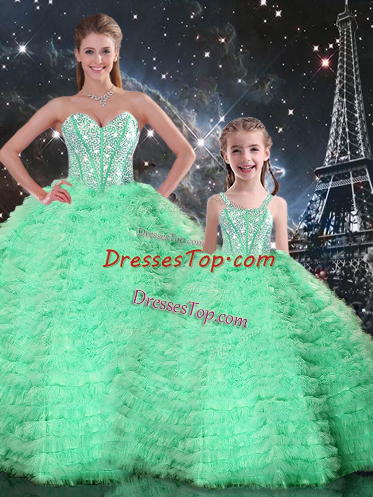 Sweetheart Sleeveless Quinceanera Dress Floor Length Beading and Ruffles Turquoise Tulle