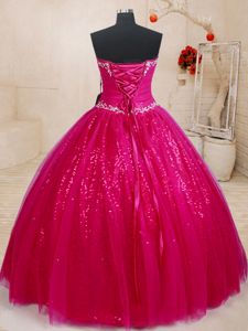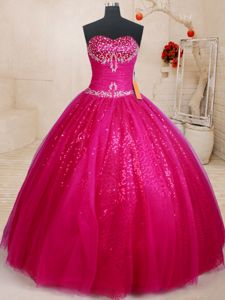 Sweetheart Sleeveless Quinceanera Dress Floor Length Beading and Sequins Fuchsia Tulle