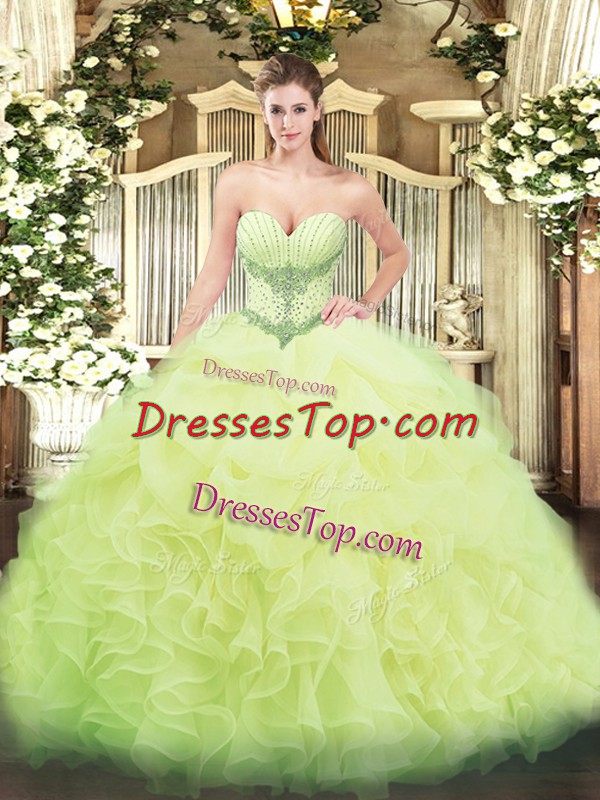 Sweetheart Sleeveless Quinceanera Gown Floor Length Beading and Ruffles and Pick Ups Yellow Green Organza