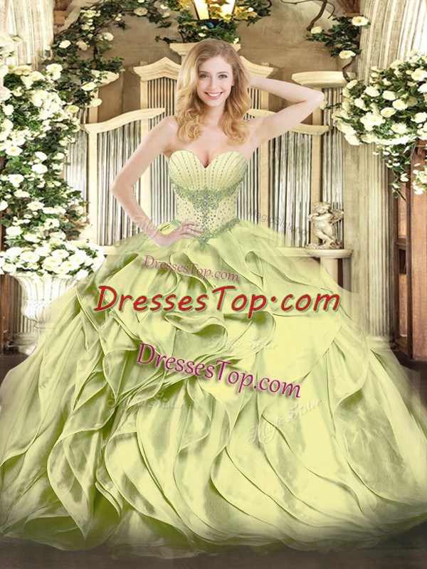 Sweetheart Sleeveless Quinceanera Gown Floor Length Beading and Ruffles Olive Green Organza