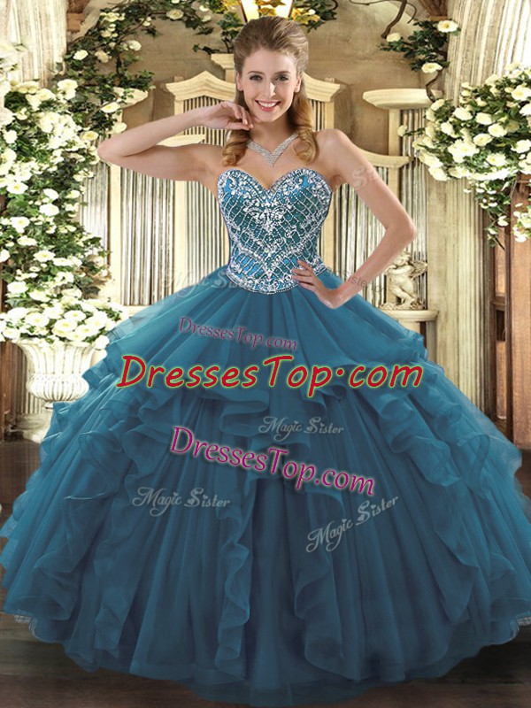 Sweetheart Sleeveless Quinceanera Gowns Floor Length Beading and Ruffles Teal Tulle