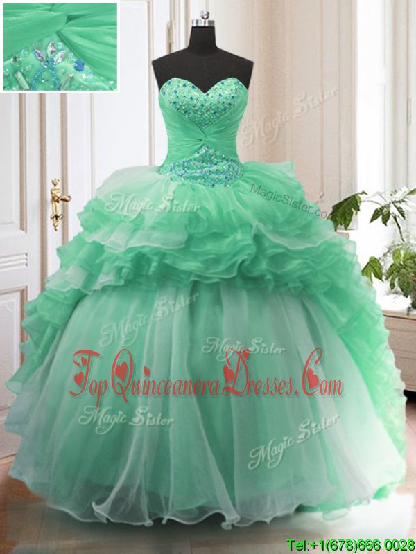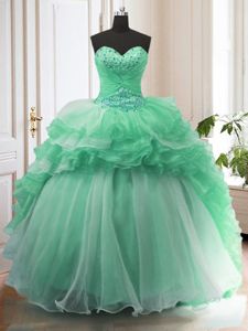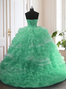 Sweetheart Sleeveless Quinceanera Gowns With Train Sweep Train Beading Apple Green Organza