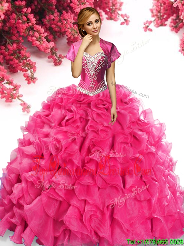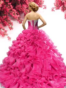 Sweetheart Sleeveless Sweep Train Lace Up Ball Gown Prom Dress Hot Pink Organza