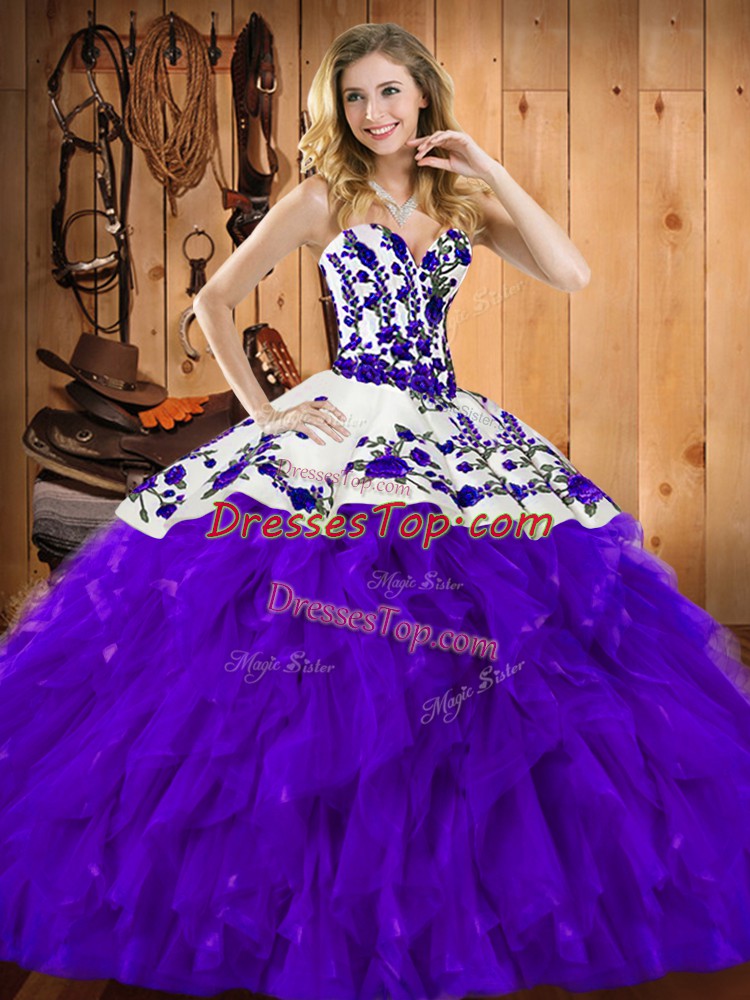 Sweetheart Sleeveless Sweet 16 Dress Floor Length Embroidery and Ruffles Purple Satin and Organza