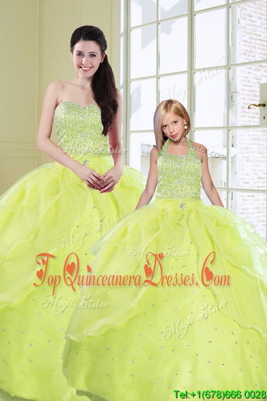Sweetheart Sleeveless Sweet 16 Quinceanera Dress Floor Length Beading and Sequins Yellow Green Organza