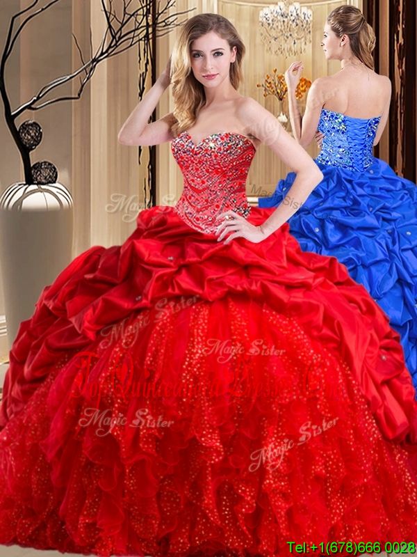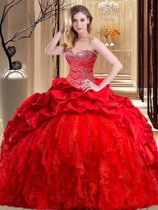 Sweetheart Sleeveless Taffeta and Tulle Quince Ball Gowns Beading and Ruffles Brush Train Lace Up