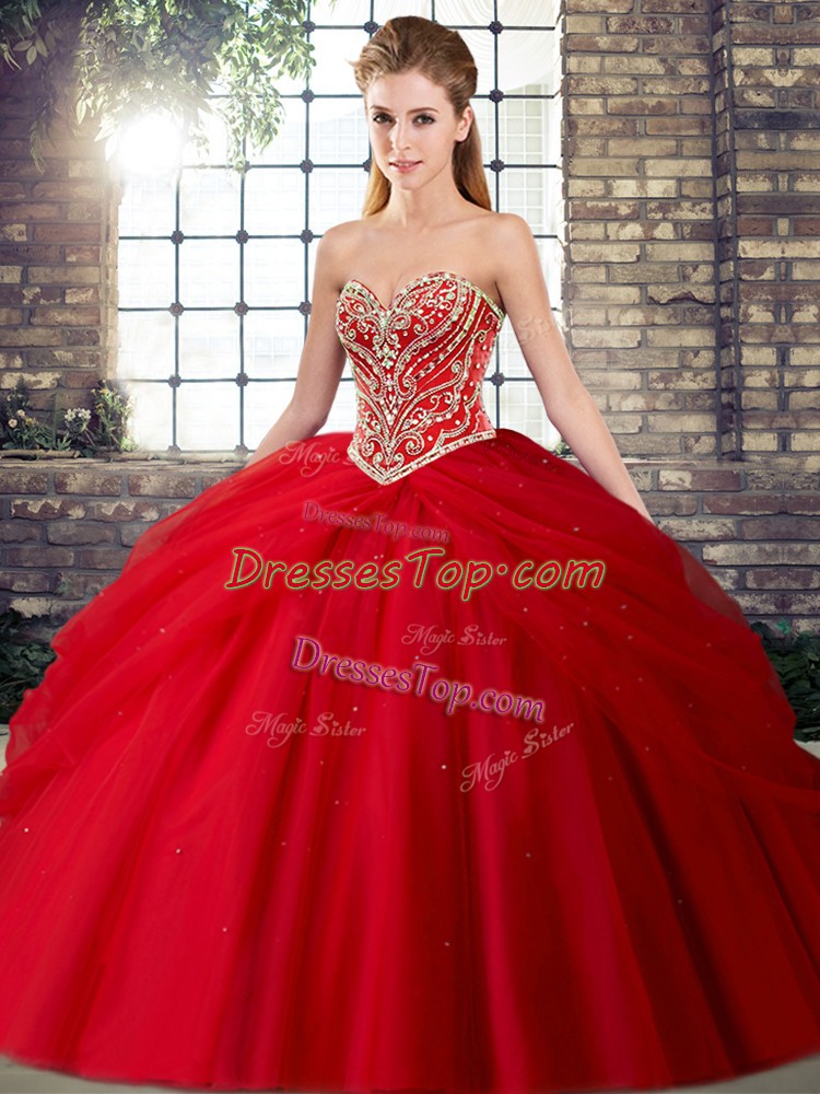 Sweetheart Sleeveless Tulle Sweet 16 Dresses Beading and Pick Ups Brush Train Lace Up