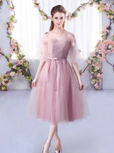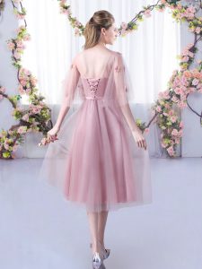 Tea Length Lace Up Vestidos de Damas Pink for Wedding Party with Lace and Belt