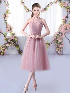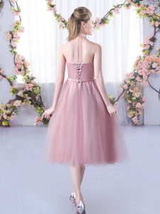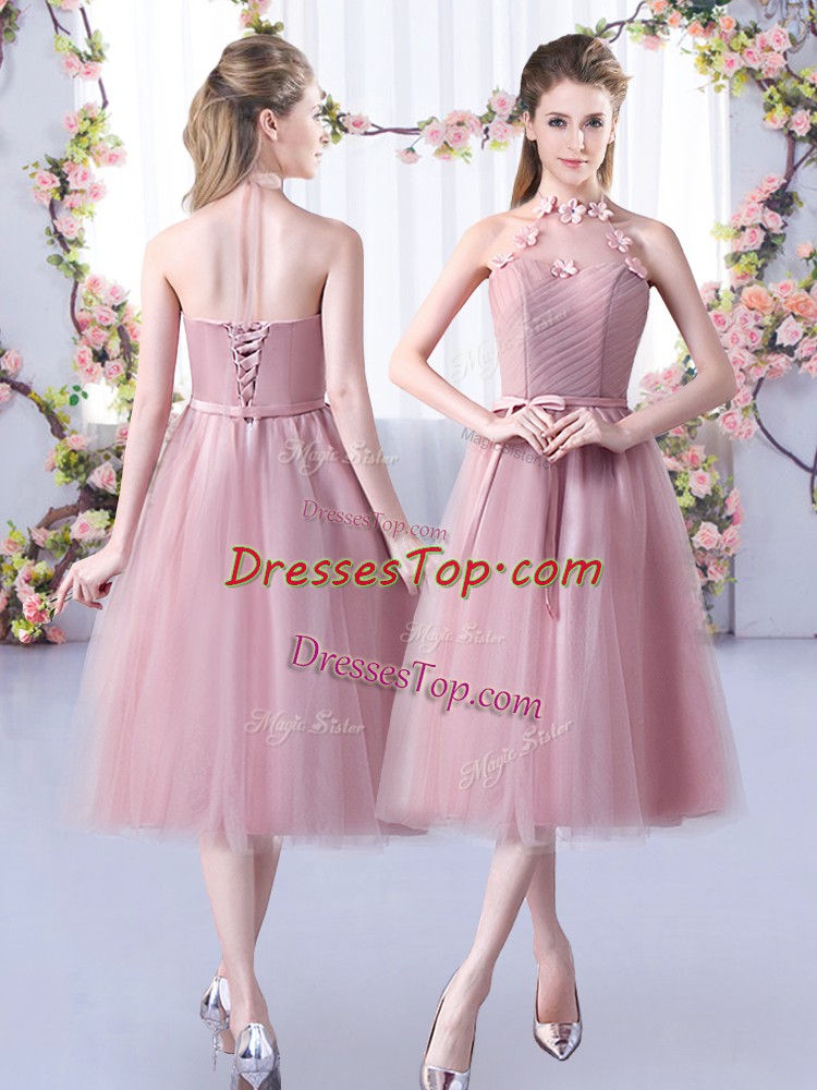 Tea Length Pink Damas Dress Halter Top Sleeveless Lace Up