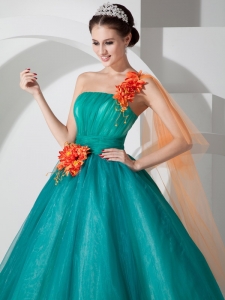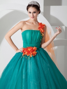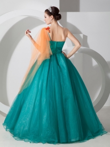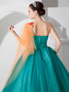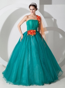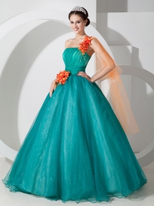 Teal A-line One Shoulder Quinceanera Dress Hand Made Flowers