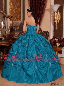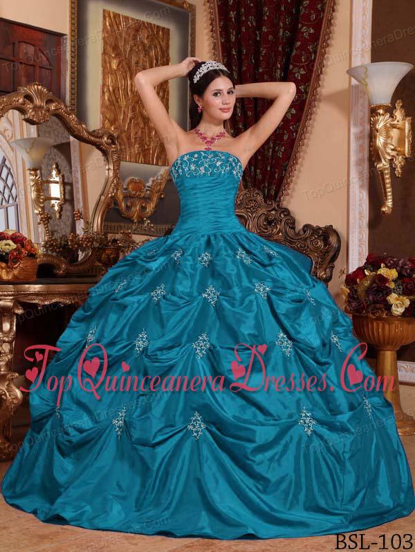 Teal Ball Gown Strapless Floor-length Taffeta Appliques Puffy Sweet 16 Gowns