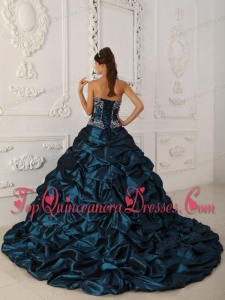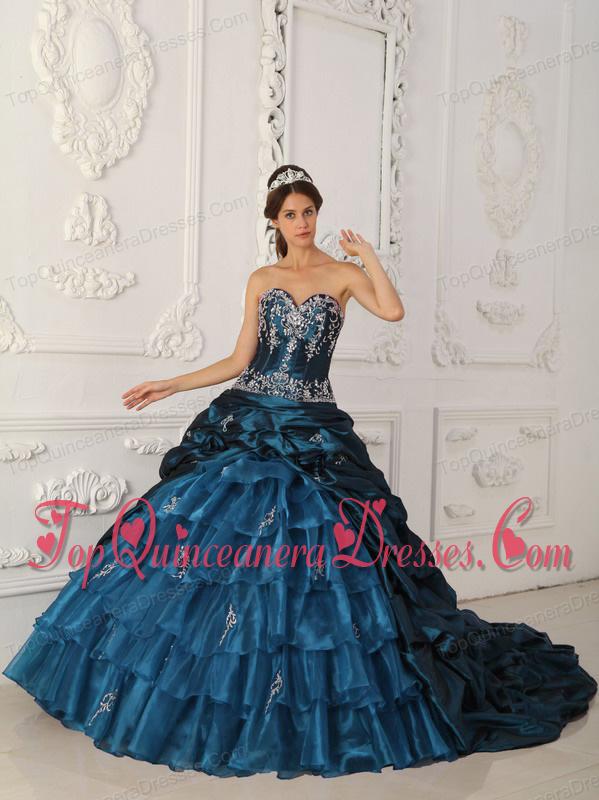 Teal Ball Gown Sweetheart Chapel Train Taffeta and Organza Appliques Quinceanera Dress