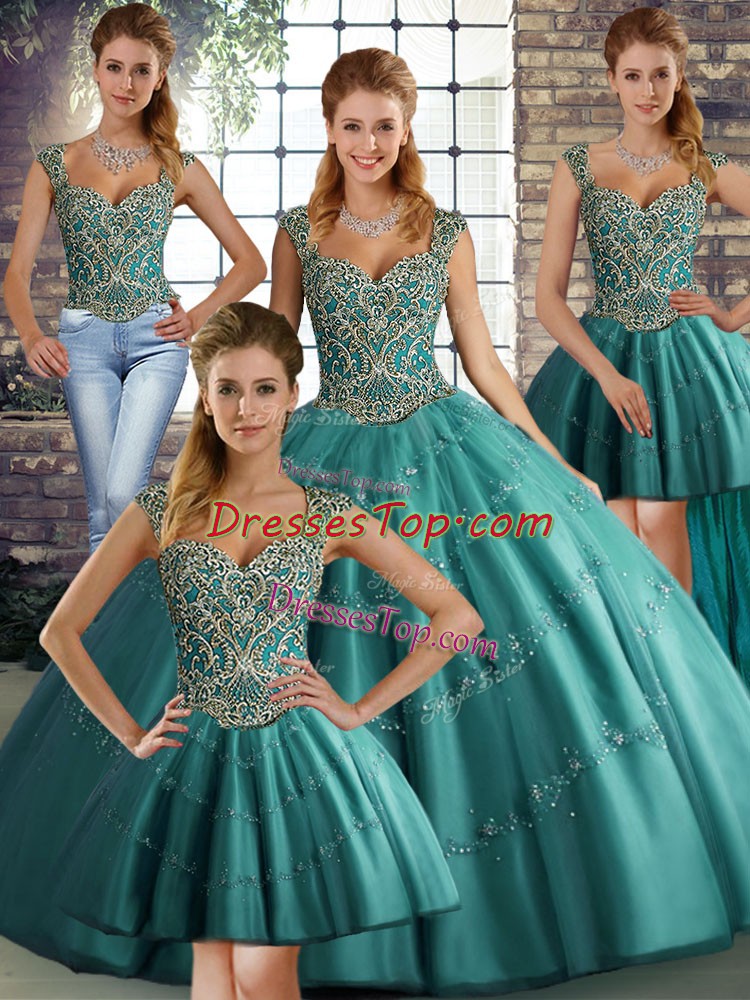 Teal Ball Gowns Beading and Appliques Quinceanera Gowns Lace Up Tulle Sleeveless Floor Length
