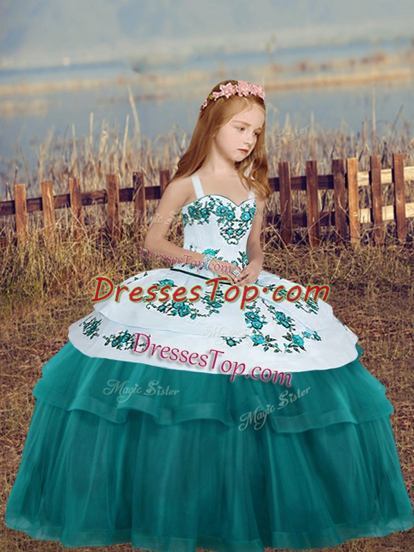 Teal Ball Gowns Embroidery Girls Pageant Dresses Lace Up Tulle Sleeveless Floor Length