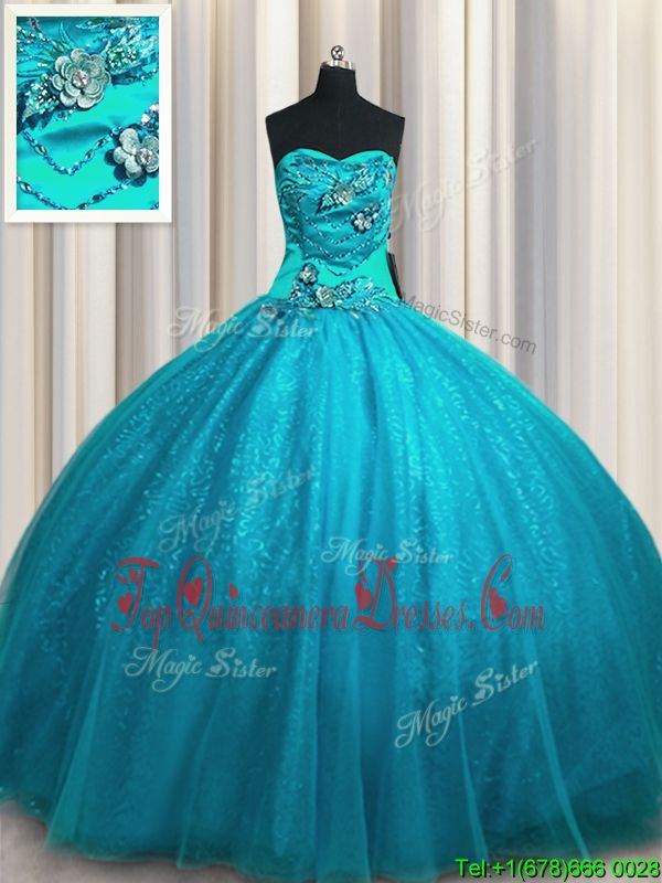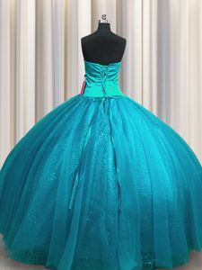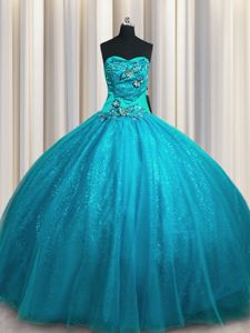 Teal Ball Gowns Tulle and Sequined Sweetheart Sleeveless Beading and Appliques Floor Length Lace Up Quince Ball Gowns