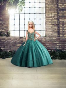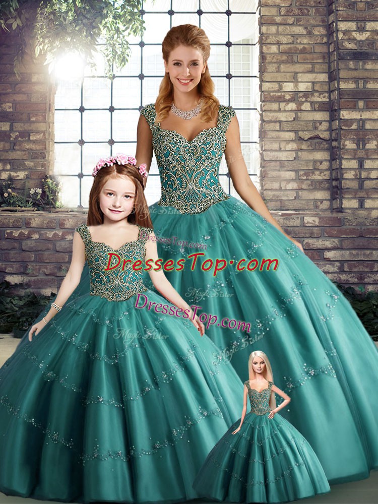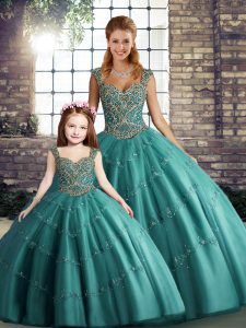 Teal Ball Gowns Tulle Straps Sleeveless Beading and Appliques Floor Length Lace Up Ball Gown Prom Dress