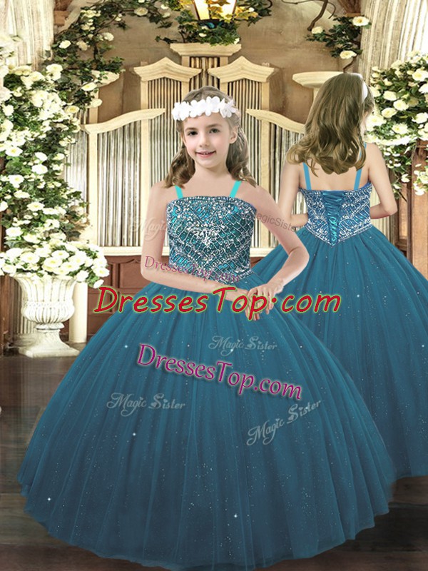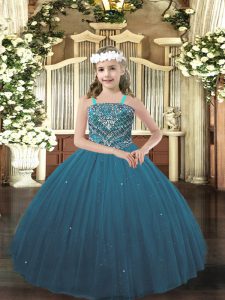 Teal Ball Gowns Tulle Straps Sleeveless Beading Floor Length Lace Up Pageant Dress Womens