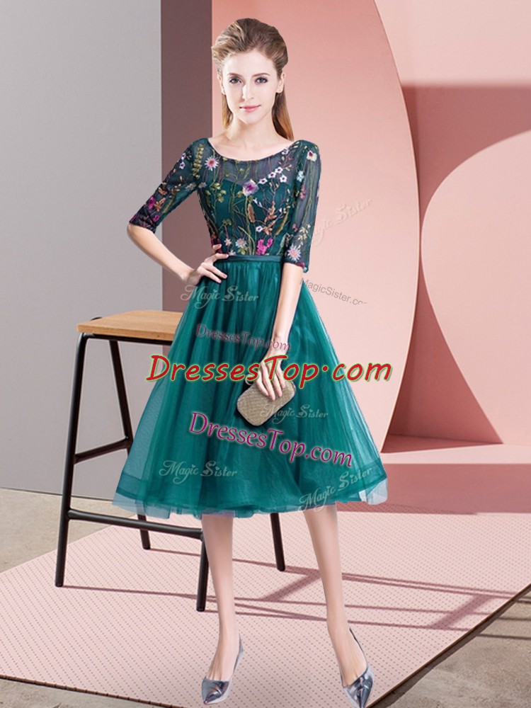 Teal Lace Up Scoop Embroidery Dama Dress for Quinceanera Tulle Half Sleeves