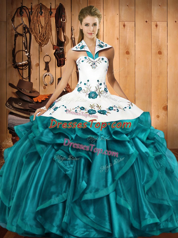 Teal Quince Ball Gowns Military Ball and Sweet 16 and Quinceanera with Embroidery and Ruffles Halter Top Sleeveless Lace Up