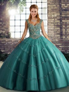 Teal Quinceanera Dresses Military Ball and Sweet 16 and Quinceanera with Beading and Appliques Straps Sleeveless Lace Up