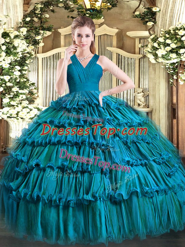 Teal Sleeveless Ruffled Layers Floor Length Quinceanera Gowns